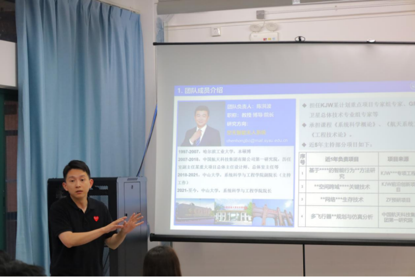特聘副研究员戚煜华老师向同学们介绍了团队情况,主要研究方向包括航天系统工程、系统仿真与效能评估技术、无人集群系统技术等。随后,团队的部分导师代表介绍了各自研究情况:王劲博副教授主要是研究空天自主飞行计算制导技术;侯燕青助理教授的研究方向是地下无人集群系统的导航;戚煜华副研究员主要研究集群无人系统协同导航;刘熙助理教授主攻与滤波相关的导航研究;伍朝显助理教授研究基于空海一体的无人系统调度和管理技术;张岐良助理教授有关结构优化领域的研究等等。
