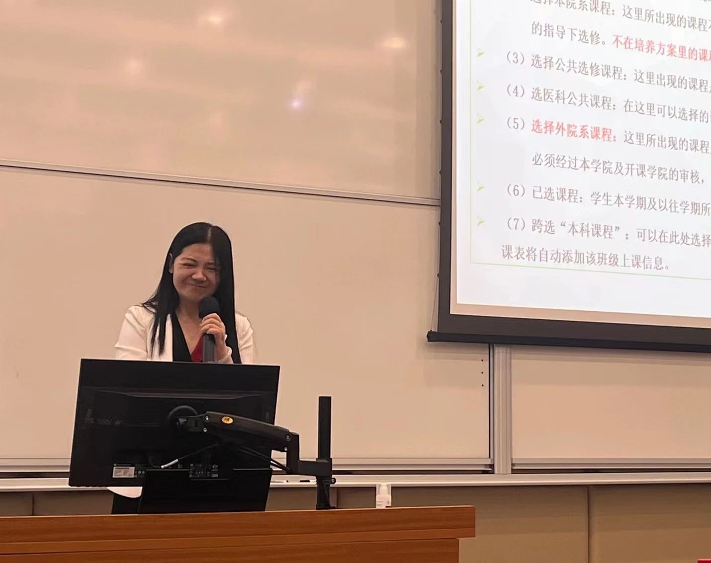 教务秘书张宝红老师从本科教学要求和研究生教学要求两个方面分别向同学们讲解了学籍注册、专业选课和学分要求等相关制度,让同学们对教务相关事宜有了初步了解。