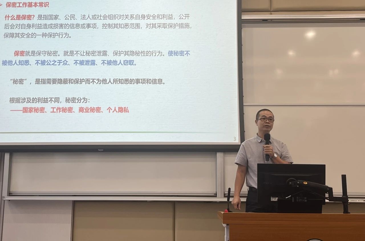杨波老师为同学们进行保密培训,介绍了保密工作和国家安全的深刻内涵,明确了日常工作中涉及的保密事项和重要规定,借助保密工作警示教育案例向同学们展示了保密工作的重要性。