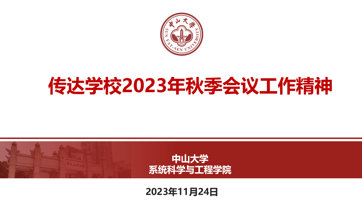 黄勇平书记传达校党委书记陈春声的总结报告精神,强调要深入贯彻落实党的二十大精神,准确理解把握深化中央巡视整改和“一校一策”工作要求,围绕中心、服务大局,进一步做好深化中央巡视整改工作。学院要进一步提高政治站位,统一思想认识,深入学习贯彻落实本次秋季工作会议精神,担负职责使命,聚焦重点难点,服务发展大局,更好地助力实现高水平科技自立自强,推动学院事业高质量内涵式发展。结合秋季报告会议精神,黄勇平书记进行了师德师风教育和廉政警示教育,他结合今年以来有关违纪违规的通报案例,强调学院教职工应严守纪律底线,筑牢思想防线,自觉维护教师职业形象,共同营造风清气正的良好生态。