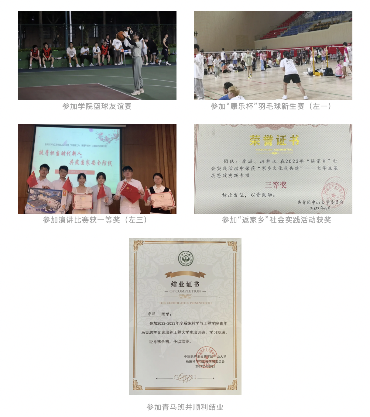 李涵参加了“淬榜样力量,铸青年声音”主题演讲比赛、“奋进新征程,共创强国业”学习党的二十大精神理论知识竞赛等比赛,积极向党组织靠拢,在比赛中均获得了一等奖的佳绩。除此之外,李涵也积极参与各种文体活动,不断提升自我,增强集体荣誉感,在团队中发挥自己的长处,为集体荣誉贡献自己的一份力量,同时也收获了同学间宝贵的友谊。