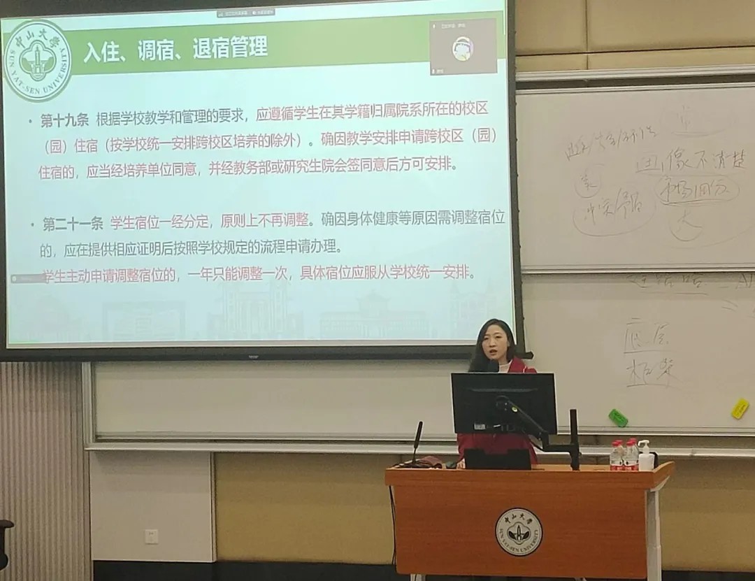 郑嘉茵老师对《中山大学学生宿舍管理办法》和《中山大学学生处分管理规定》进行宣讲,通过制度解读与丰富的案例,针对宿舍生活中的安全问题、日常校园生活的底线管理做了详细的讲解和指导,强化了同学们的规则意识,为同学们顺利开展学习生活,打下坚实的安全防线。