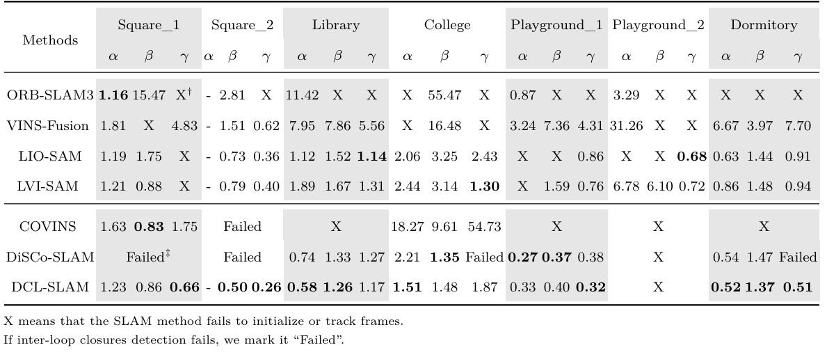 如表1所示,团队在 S3E 数据集上提供了四个单机器人 SLAM 和三个 C-SLAM 基线,评价指标为 ATE,均是目前的主流 SLAM 算法。其中前者包括 ORB-SLAM3、VINS-Fusion、LIO-SAM 以及 LVI-SAM。后者包括 COVINS、DiSCo-SLAM 以及 DCL-SLAM。