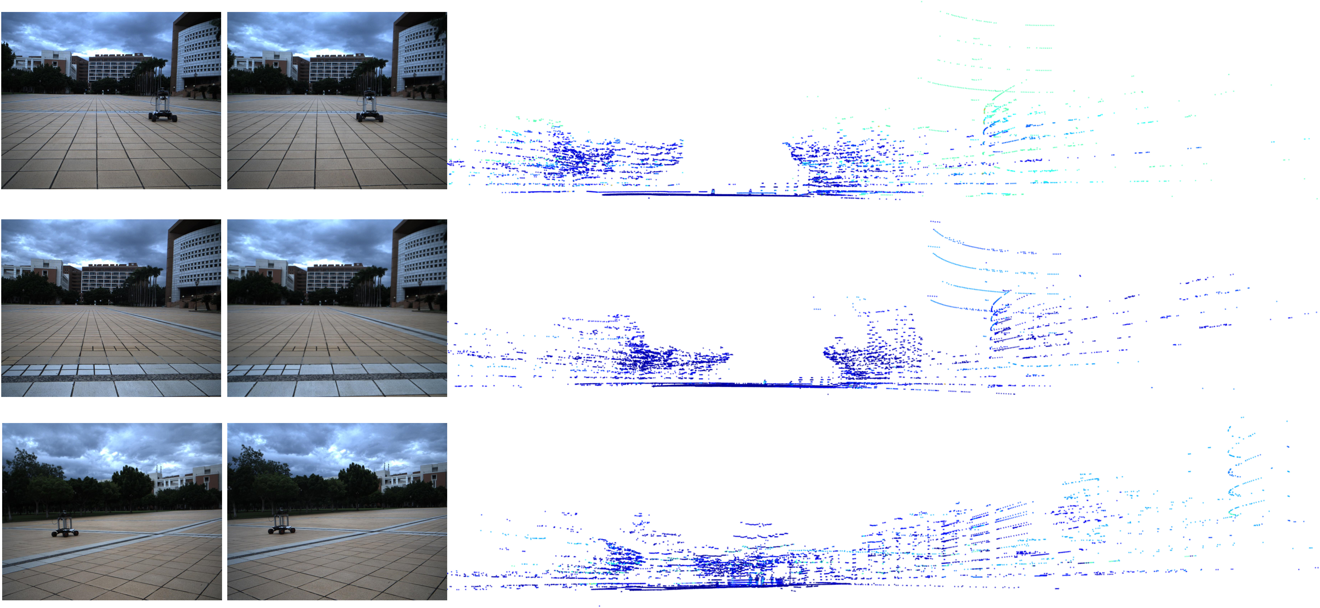 Figure 2: S3E 数据集的数据示例,每行都显示了不同平台同时捕捉到的双目图像和点云。