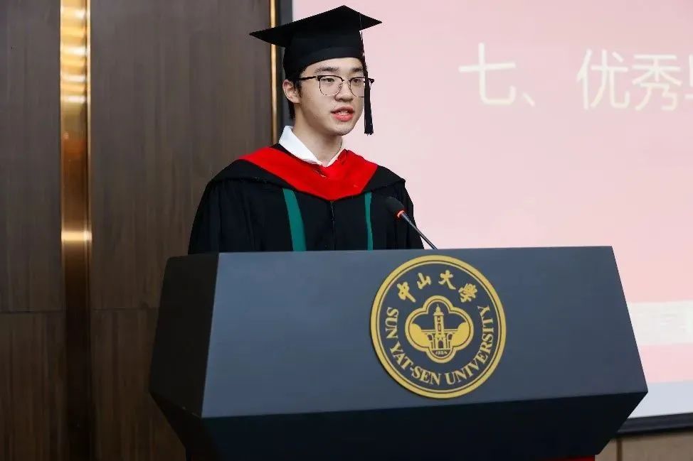 本科生代表邓恢霆同学首先代表全体本科毕业生表达对学院、领导及老师们最衷心的感谢和敬意。他回想起在学院的奋斗故事,同学一同复习迎接期末考试,参加足球队为学院争光,在这个过程中收获了深厚的友谊,也锤炼了自身灵魂的韧性,感谢同学们团结一致,感谢学院老师关心。作为系统学子,他认为要敢于追求,牢记使命担当,不管是深入科研道路,还是投入社会建设的实践前沿,都要脚踏实地,坚守初心。