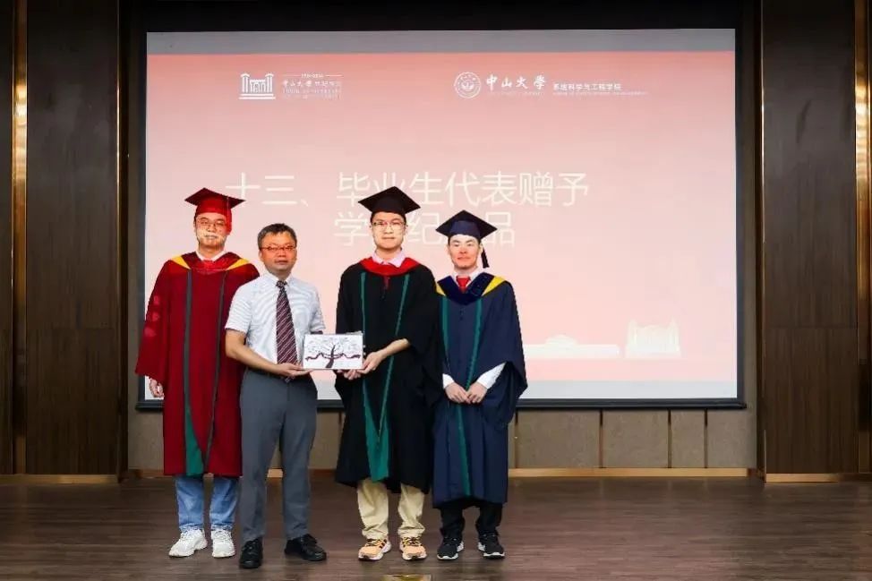 灼灼青年志,深深母校情。本科生、硕士、博士代表上台向学院赠送毕业纪念品。纪念礼品画像中树上结果寓意着学院桃李满天下,果子写满毕业生们的名字,象征着毕业生们在学院的平台资源中茁壮成长,硕果累累。