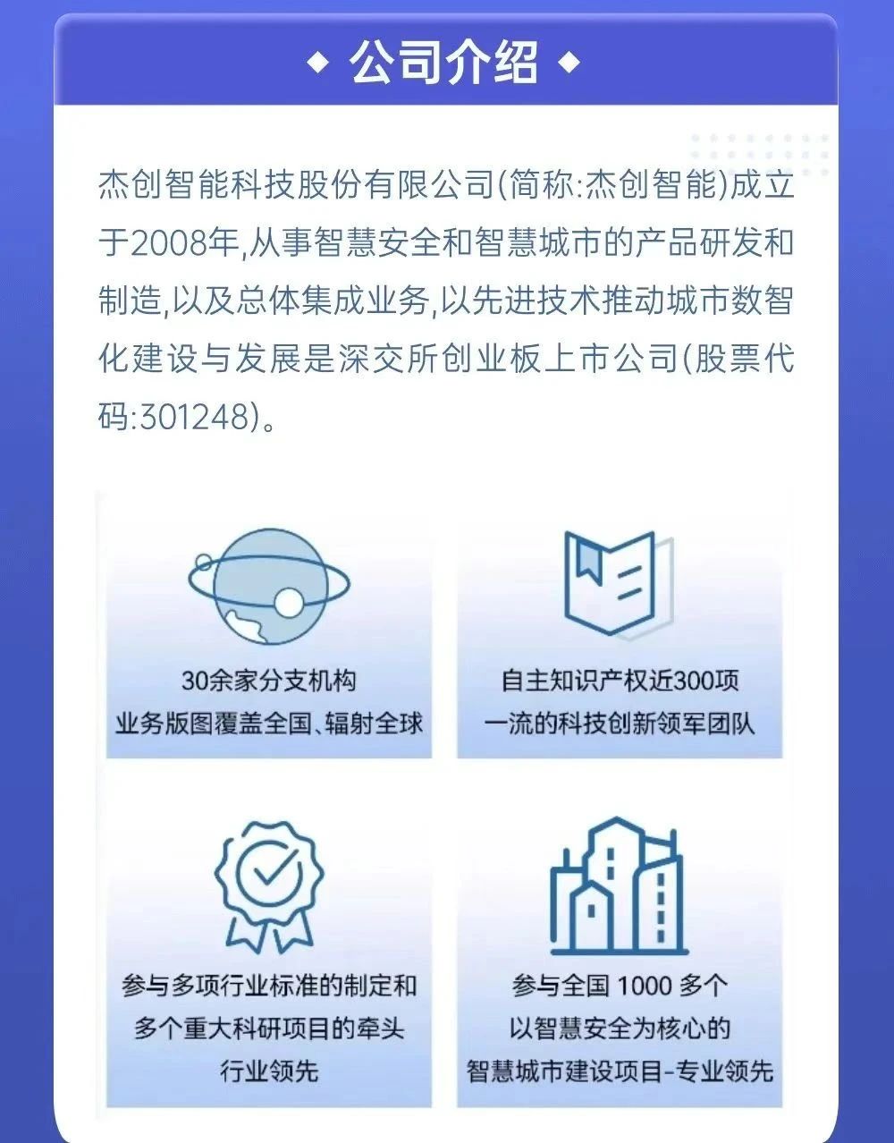 杰创智能科技股份有限公司(简称:杰创智能)成立于2008年,从事智慧安全和智慧城市的产品研发和制造,以及总体集成业务,以先进技术推动城市数智化建设与发展,是深交所创业板上市公司。杰创智能采用广州、北京双总部运作模式,在全国范围内设有30余家分支机构,业务覆盖全国辐射全球,先后参与全国1000多个以智慧安全为核心的智慧城市建设项目。