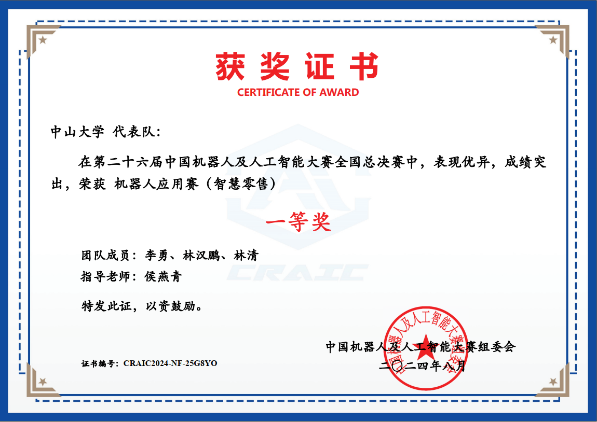 获奖情况:全国总决赛机器人应用赛(智慧零售)一等奖