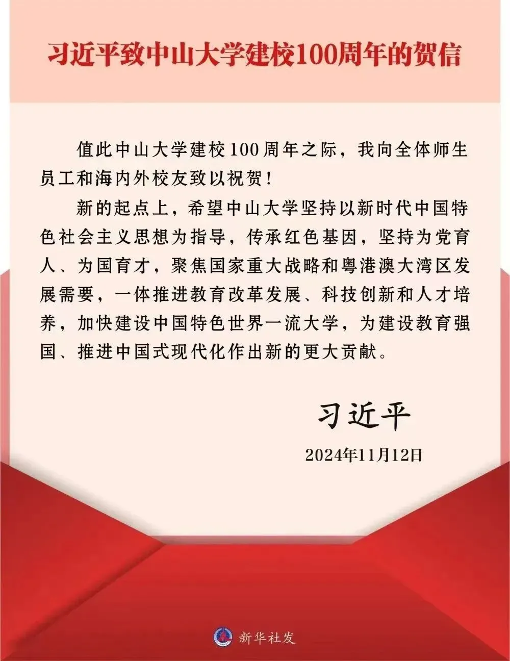 2024年11月12日,在中山大学建校100周年之际,习近平总书记向中山大学全体师生和海内外校友致信祝贺。
