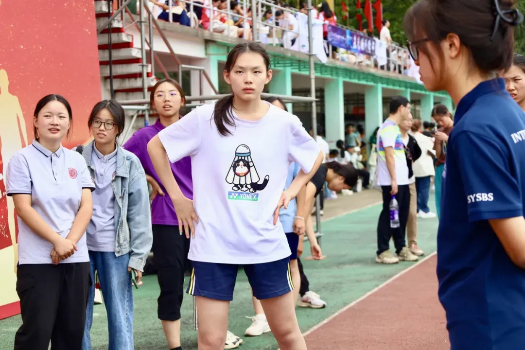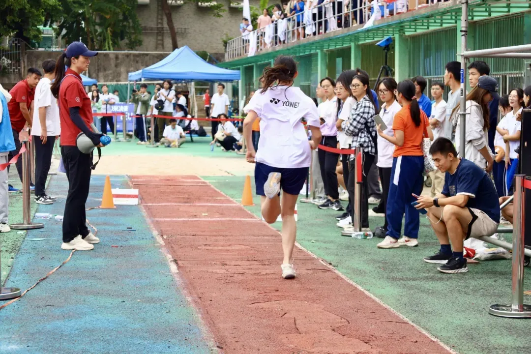 跳远场地,同学们奋力跃起,挑战极限。三级跳远三次飞跃,助跑加速腾空而起。毛俪钐同学眼神坚毅,冲刺跃起,在空中画出一条优美的曲线,落地稳定成绩斐然。荣获女子三级跳远第四名的好成绩
