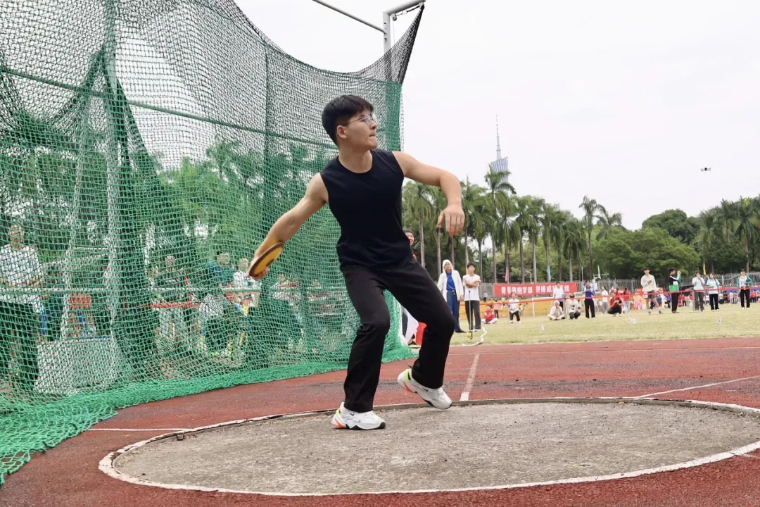 谭苟同学旋转发力,铁饼划破长空,弧线优美,获得第八名。