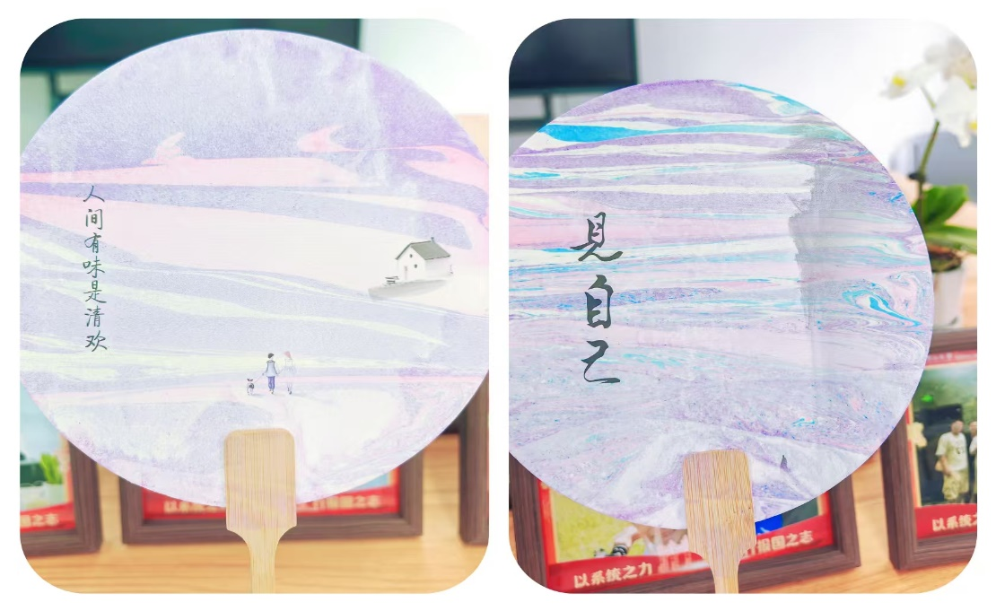 生日会后,大家兴致勃勃地参与了非遗漆扇制作。在老师的指导下,大家选取了心仪的扇面图案和喜欢的颜色,将调制好的颜料滴入清水中,再将扇子垂直浸入水中,采用“旋转法”或“Z字法”使扇面充分染色,然后快速从水中提起并用吸水纸擦干扇子表面水分等待自然风干,一把把独具匠心的漆扇便诞生了。每个人都为自己的作品感到自豪,不仅体验了传统工艺的魅力,还收获了独特的纪念品。这次活动让大家深刻感受到非遗文化的深厚底蕴和无穷魅力。