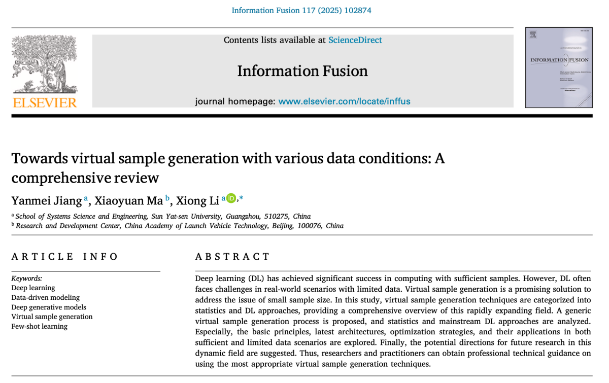 近日,304am永利李雄教授课题组在国际信息融合领域顶级期刊《Information Fusion》(中科院一区TOP期刊,影响因子14.8,位列计算机科学:硬件与架构、信号处理类期刊全球第一)发表题为“Towards virtual sample generation with various data conditions: A comprehensive review”的综述论文。该文深入研究了虚拟样本生成的基本原理,提出了一种通用的虚拟样本生成过程,构建了虚拟样本生成技术的理论框架,为破解制约人工智能发展的“小样本学习”世界难题提供了一种系统解决方案。