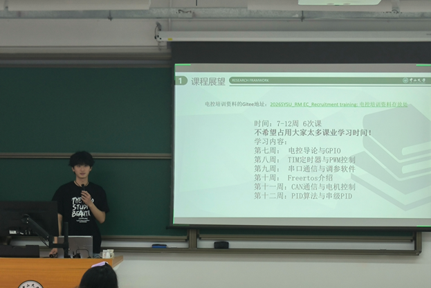 接下来,中山大学机器人协会会长吴浩铭以及协会骨干为选手进行赛题介绍与规则说明,并精心准备了竞赛培训系列课程,从机械原理的精妙构造,到电控系统的运行逻辑,再到硬件设备的核心要点,帮助同学们搭建起扎实的知识框架,为大家后续的创新实践筑牢根基,助力每一位怀揣创意的同学都能突破技术瓶颈,将脑海中的奇思妙想转化为现实,更好迎战。