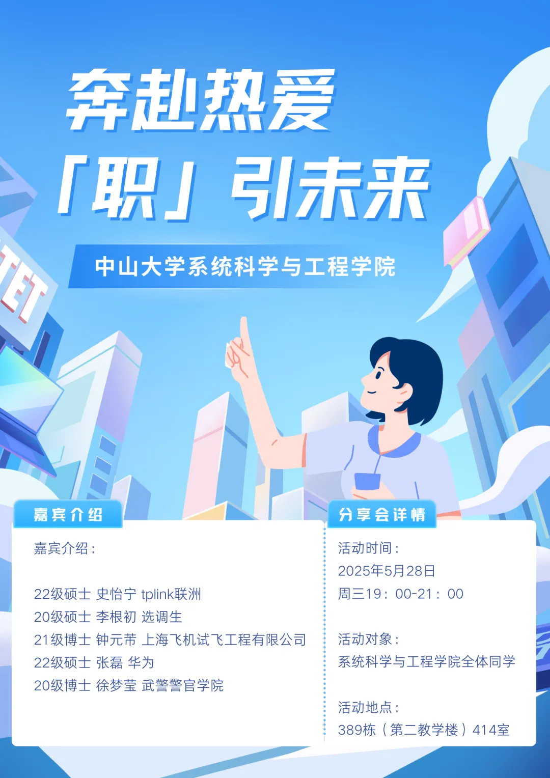为帮助同学们更好地认知不同岗位就业发展可能性,做好求职方向规划,我们本次诚挚邀请多位毕业生,围绕选岗心得、简历润色、笔试准备、面试技巧、职业介绍、求职心路历程等主题进行经验分享,并与同学们互动交流、答疑解惑。