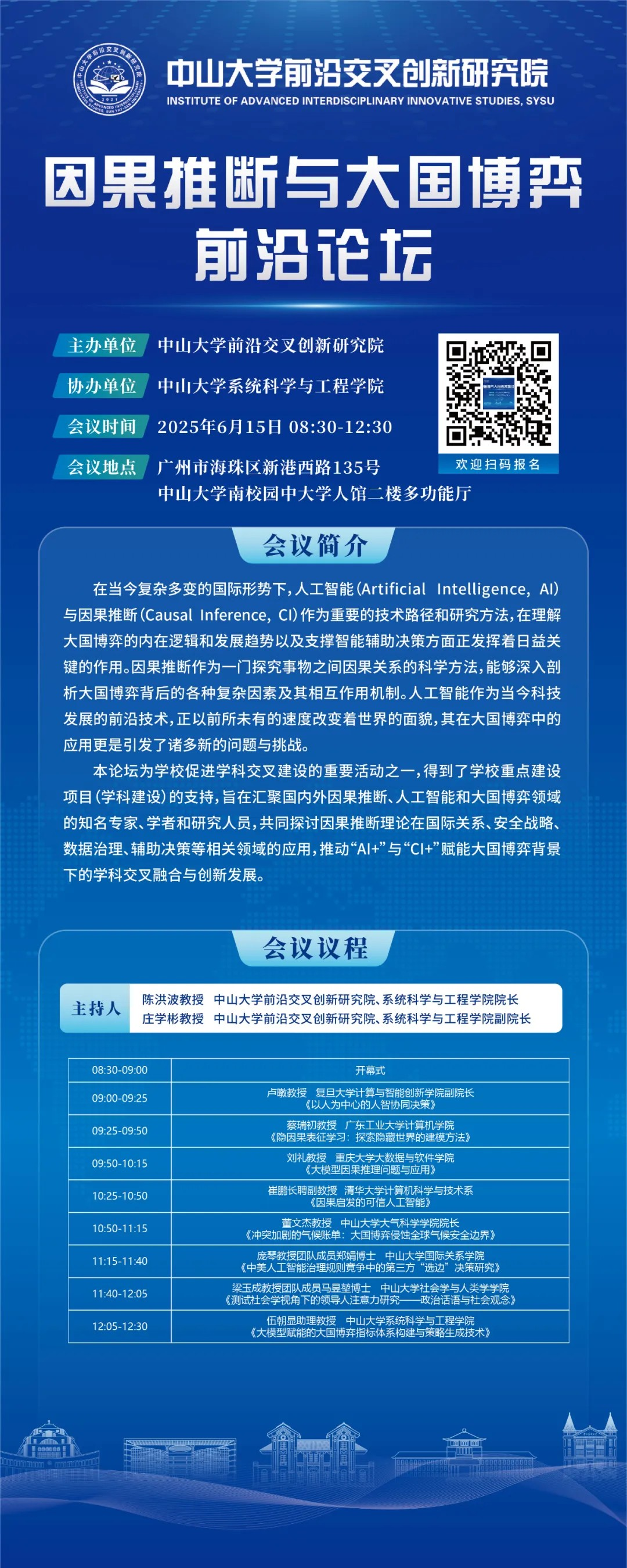 本论坛为学校促进学科交叉建设的重要活动之一,得到了学校重点建设项目(学科建设)的支持,旨在汇聚国内外因果推断、人工智能和大国博弈领域的知名专家、学者和研究人员,共同探讨因果推断理论在国际关系、安全战略、数据治理、辅助决策等相关领域的应用,推动“AI+”与“CI+”赋能大国博弈背景下的学科交叉融合与创新发展。