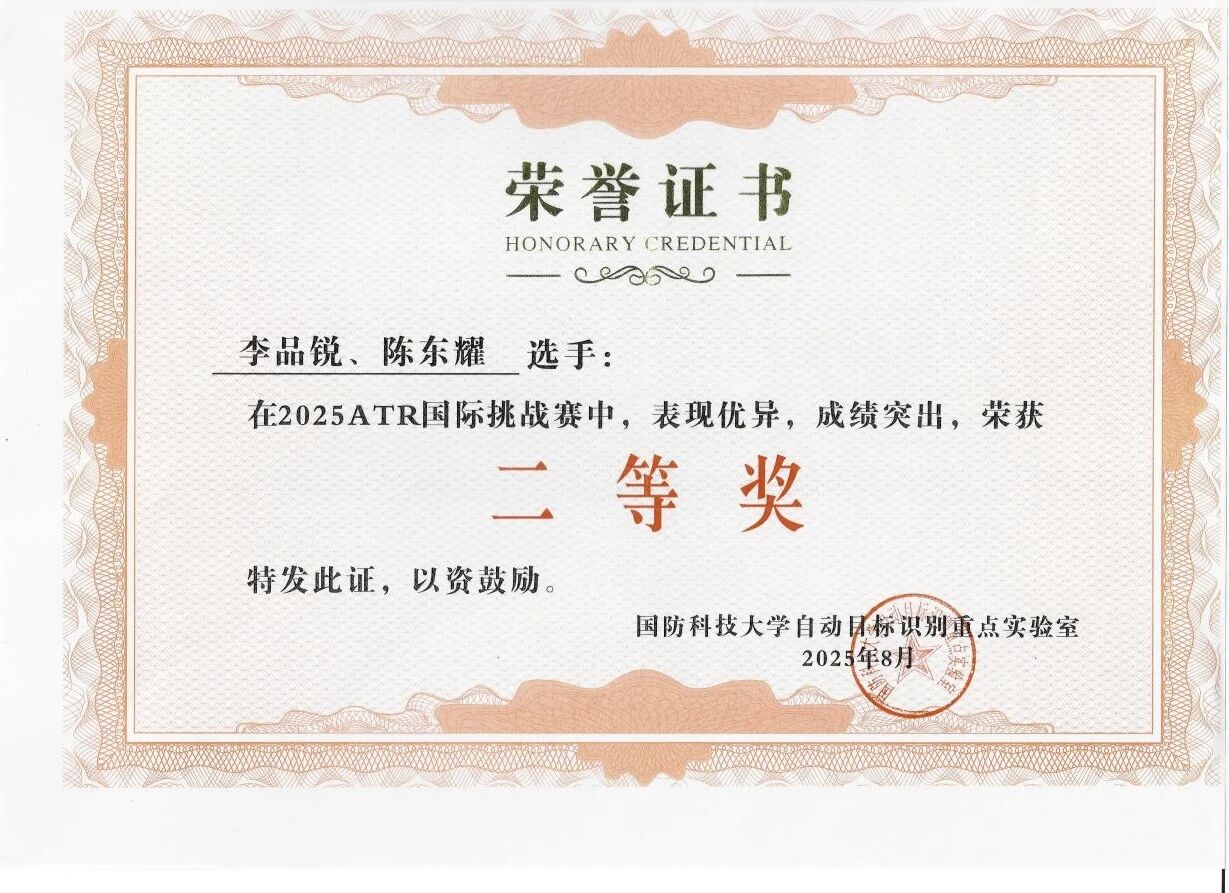 2025年8月31日,第四届ATR国际挑战赛决赛在长沙圆满落幕,我院博士生李品锐,硕士生陈东耀组成的“追梦队”在参赛的66支代表队中脱颖而出,获得大赛二等奖,展现了中大学子的科创实力与竞技风采。