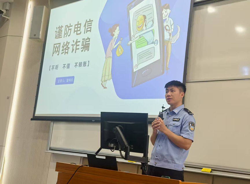 学院邀请了新港社区民警曾伟东警官开展防诈骗安全教育。曾警官通过刷单返现、冒充客服、虚假交易、冒充公检法、冒充熟人、注销校园贷等六类常见骗局案例,提醒同学们提高防范意识,保护财产安全人身安全。