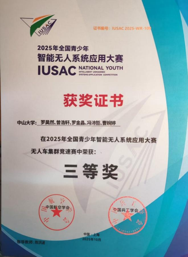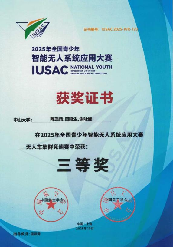 大赛以“智能科技为桥,国防教育为魂”,是首届聚焦国防教育的青少年智能无人系统赛事。大赛设置光纤遥控飞行、地面反无人机群、空地无人协同对抗、无人车集群竞速与协同运输等五大实战化赛项,全面考察选手的技术功底、创新思维与国防素养,旨在引导广大青少年在探索前沿技术中领悟国家安全,点亮国防初心。来自全国25个省份106所军地院校的291支队伍同场竞技,我院两支队伍代表中山大学出征,在无人车集群赛道与军地精英展开技术交锋,荣获三等奖,学校获评优秀组织奖。