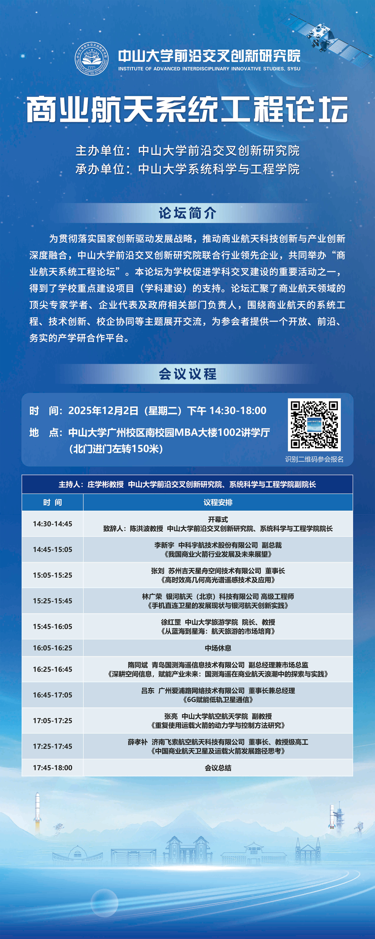为贯彻落实国家创新驱动发展战略,推动商业航天科技创新与产业创新深度融合,中山大学前沿交叉创新研究院联合行业领先企业,共同举办“商业航天系统工程论坛”。本论坛为学校促进学科交叉建设的重要活动之一,得到了学校重点建设项目(学科建设)的支持。论坛汇聚了商业航天领域的顶尖专家学者、企业代表及政府相关部门负责人,围绕商业航天的系统工程、技术创新、校企协同等主题展开交流,为参会者提供一个开放、前沿、务实的产学研合作平台。