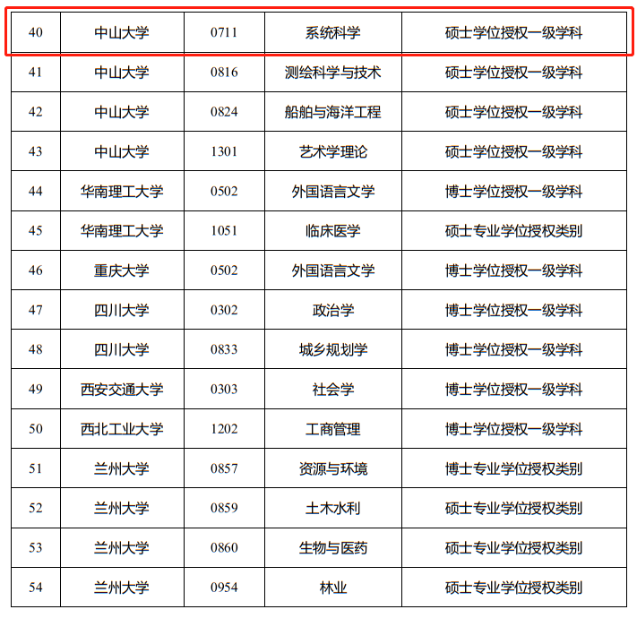 54个新增学位点来自27所高校,其中中山大学共新增6个学位点,中国人民大学新增5个学位点,兰州大学、北京大学均新增4个学位点,上海交通大学新增3个学位点。中南大学、中国科学院大学、同济大学、天津大学、四川大学、厦门大学、南京大学、华南理工大学、华东师范大学和东南大学等各新增2个学位点。