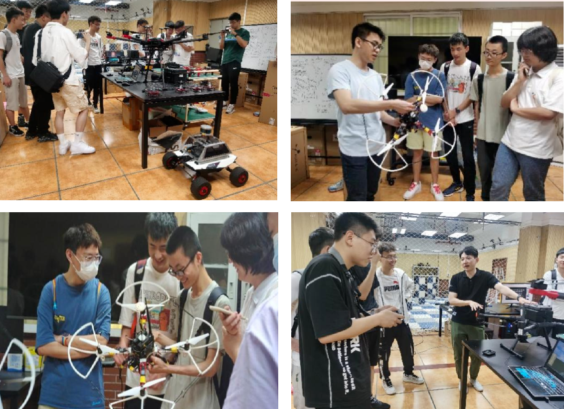 戚煜华老师带领大家走进实验室,观看无人机/无人车关键技术演示。同学们来到实验室,沉浸式地观摩各个研究方向,接触到智能无人集群系统的协同自主感知技术研究、以及无人机群智能决策与自主规划技术研究。同学们也按捺不住对科研的喜爱,亲自动手操作无人机,操作虚拟仿真设备,感受科技的魅力。